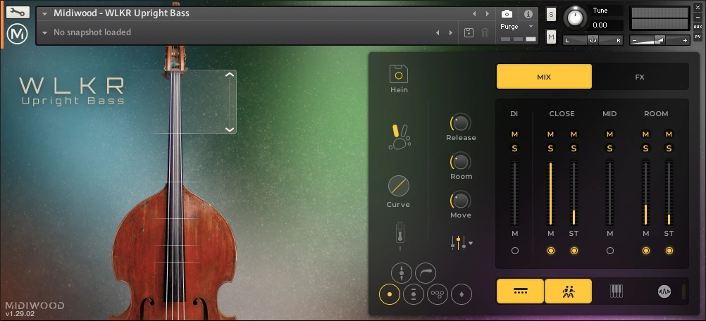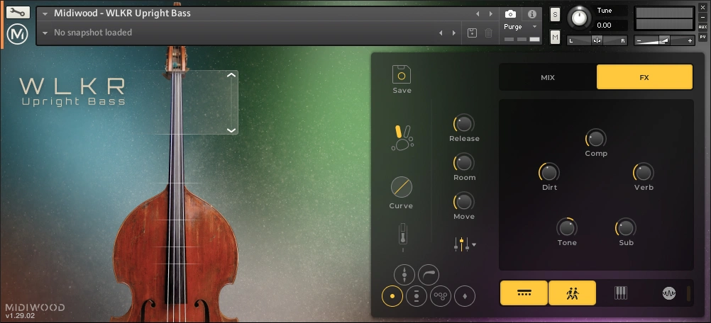 Select your preferred finger technique, adjust release sample volumes, add room background noise, or include extra fretboard movement sounds—all with simple, intuitive controls. Your six articulations are conveniently mapped from C-2, with options to play open notes when available or follow natural hand positions with real vibrato. The Mix panel provides access to six mic positions for custom blending, complete with ten sound presets and the ability to save your own. The FX panel offers five carefully chosen effects: subtle compression, room reverb, subsonic boost, custom tone shading, and dirt distortion (if it works for Chris Wood of Medeski Martin & Wood, it can work for you). A special feature allows bypassing Kontakt’s main output, sending all channels to separate outputs for complete mixing control with your own plugins. The complexity serves the music; the interface serves the musician.